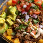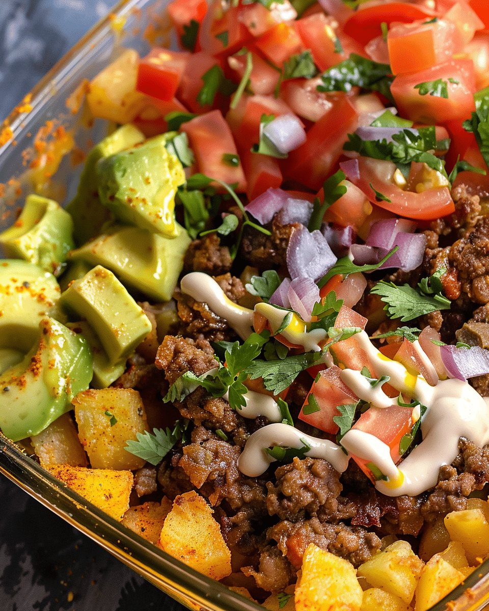 I store the components separately in airtight containers in the fridge for up to 4 days. To reheat, I warm the potatoes and taco meat in the microwave or a skillet, then assemble the bowl with cold toppings just before eating. This keeps everything fresh and prevents sogginess.