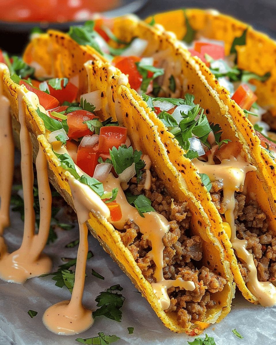 These tacos are packed with seasoned beef and drenched in a rich, creamy cheese sauce—perfectly topped with fresh veggies for a mouthwatering meal.