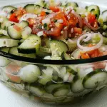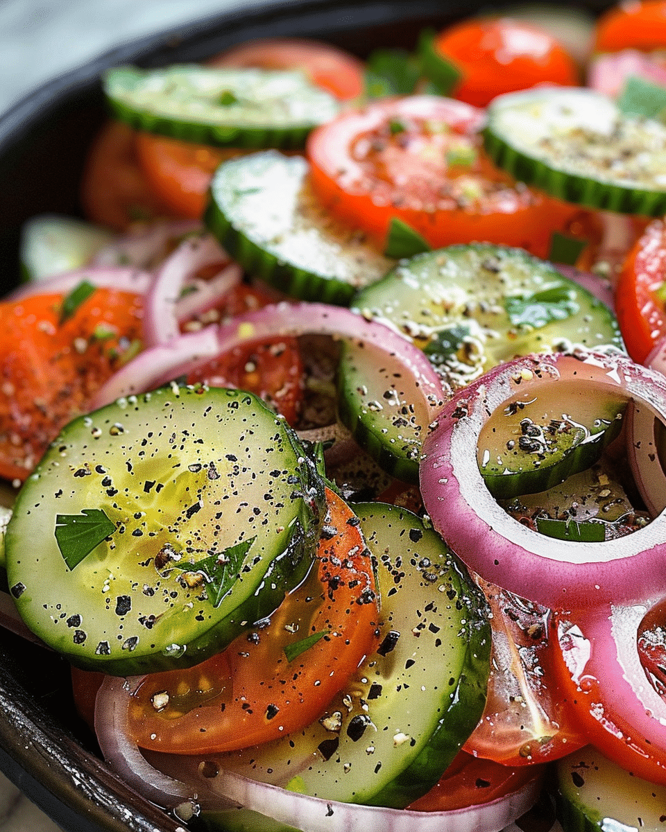 This crisp, tangy salad is a refreshing mix of cucumbers, onions, and tomatoes tossed in a simple marinade with olive oil, vinegar, and dill. A go-to side for summer cookouts or weeknight dinners.