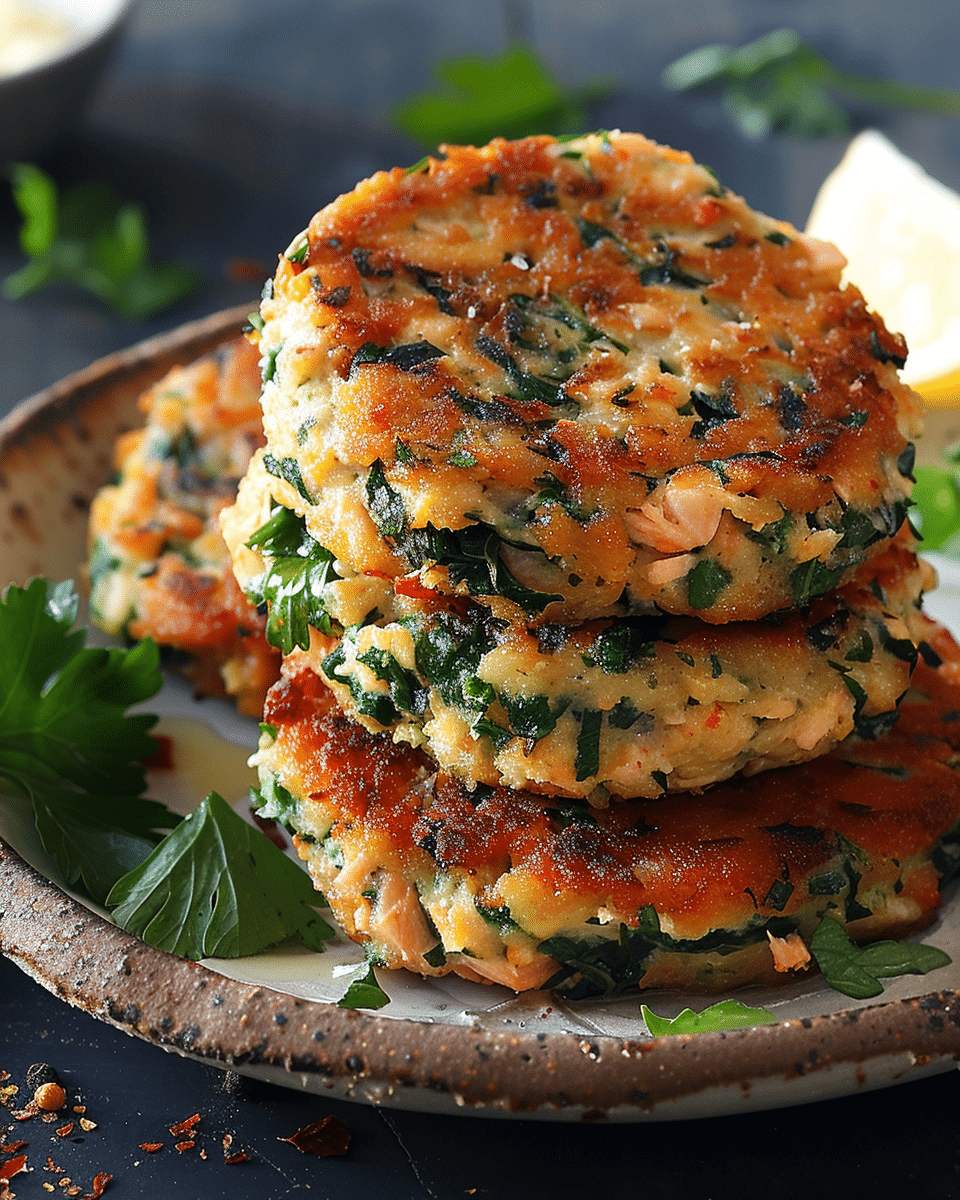 These golden salmon patties are packed with spinach, feta, lemon, and herbs for a fresh Mediterranean twist. Serve with lemon wedges and tzatziki for a light and flavorful meal.