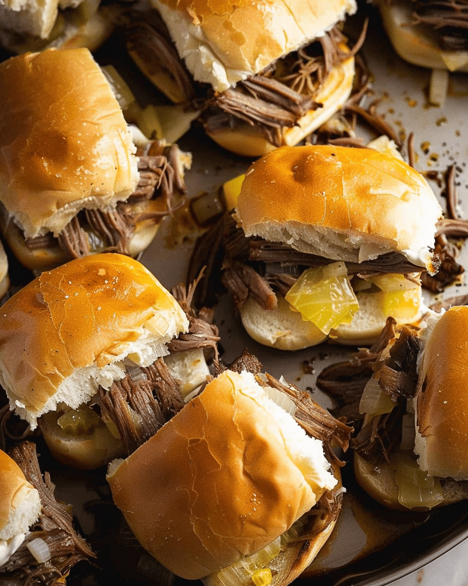 Tender, buttery Mississippi pot roast piled onto toasted Hawaiian rolls with melty provolone and tangy pepperoncini, then baked golden and served with rich au jus for dipping.