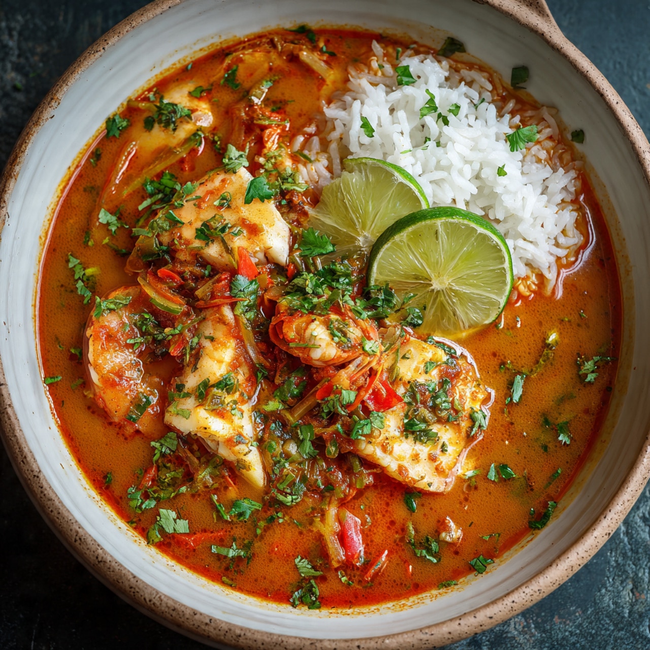 A rich and comforting coconut-based fish stew with bold spices, sweet peppers, and fresh lime—this classic Brazilian moqueca is perfect over fluffy jasmine rice.
