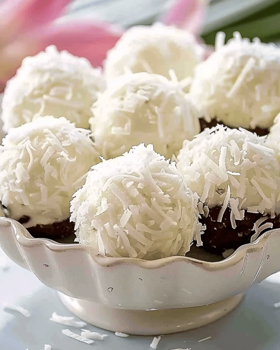 These sweet and creamy no-bake coconut balls are dipped in chocolate for the perfect bite-sized treat—quick to make and irresistibly smooth.