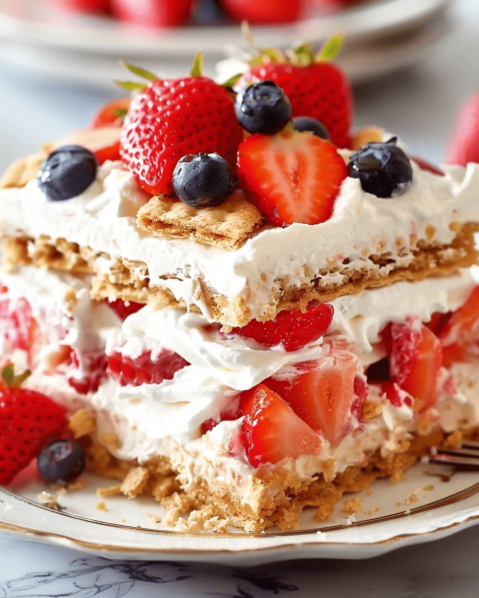 This creamy no-bake strawberry cake is layered with graham crackers, fresh berries, and a whipped cream cheese filling—an easy and refreshing summer dessert.