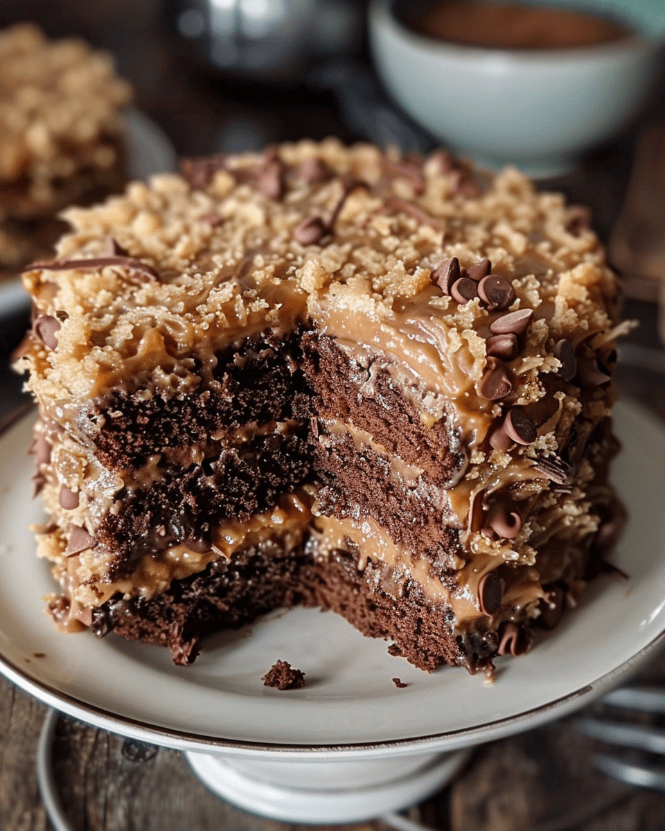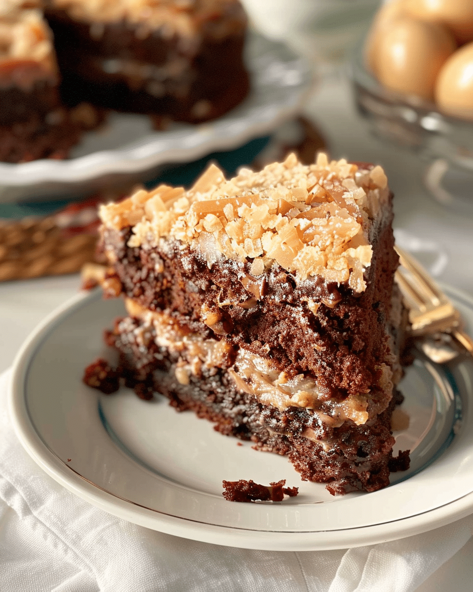 A rich, moist German chocolate cake topped with a buttery coconut-pecan frosting and sweetened condensed milk. A nostalgic dessert perfect for birthdays or holidays.