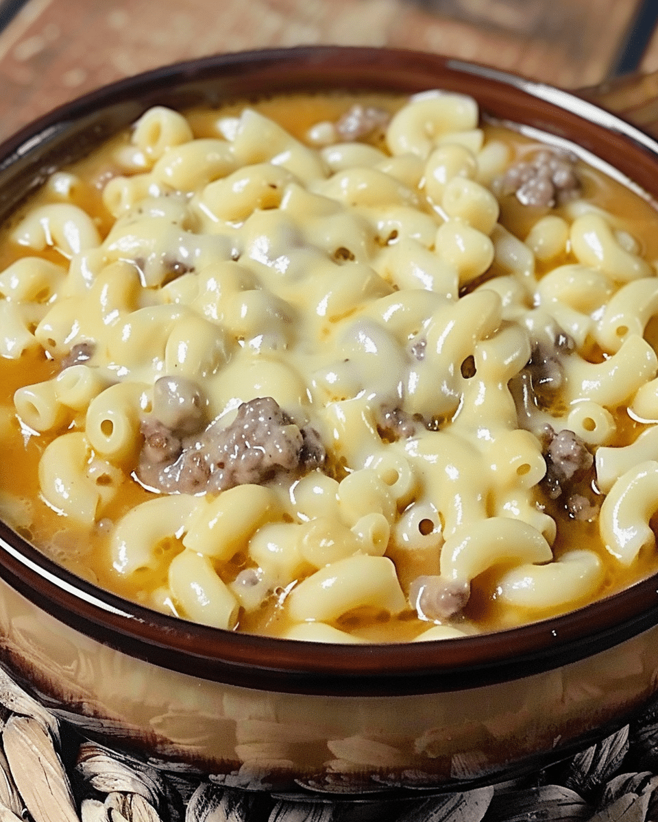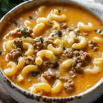 This cheesy, comforting one-pot macaroni cheeseburger soup is packed with ground beef, pasta, tomatoes, and melted cheddar—perfect for a cozy family meal.