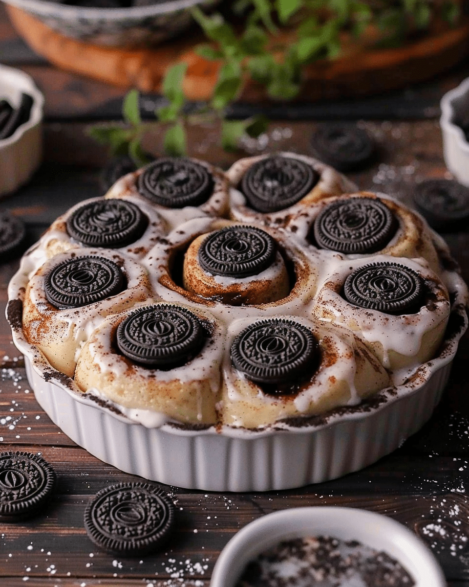 These soft and fluffy cinnamon rolls are stuffed with a surprise Oreo inside and finished with a rich cream cheese frosting—perfect for brunch, dessert, or any Oreo lover!