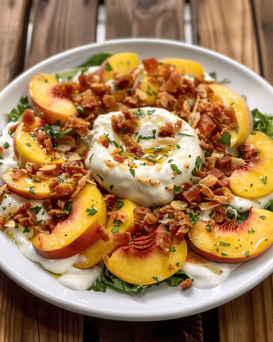 This Peach Burrata Salad is the ultimate summer dish—juicy peaches, creamy burrata, and crisp greens drizzled with balsamic glaze. Fresh, simple, and perfect for warm-weather dining.