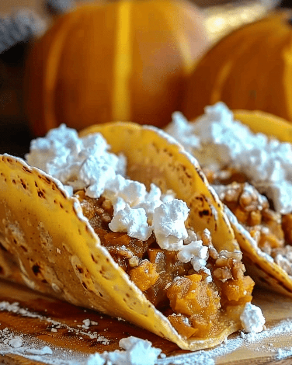 Pumpkin pie tacos are a fun and festive fall dessert with creamy spiced filling and crispy cinnamon-sugar taco shells. Topped with whipped cream, they’re perfect for autumn parties and holiday treats.