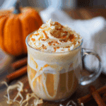 To finish, I top the latte with a generous spoonful of whipped cream, a sprinkle of ground nutmeg, and a drizzle of extra pumpkin syrup for that coffee-shop look.