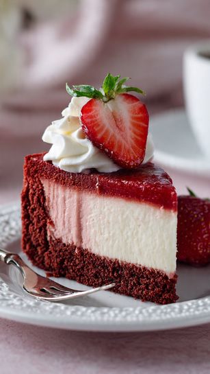 This layered dessert combines rich red velvet crumbs with creamy cheesecake and fresh strawberries. Topped with whipped cream, it’s perfect for holidays or any special celebration.