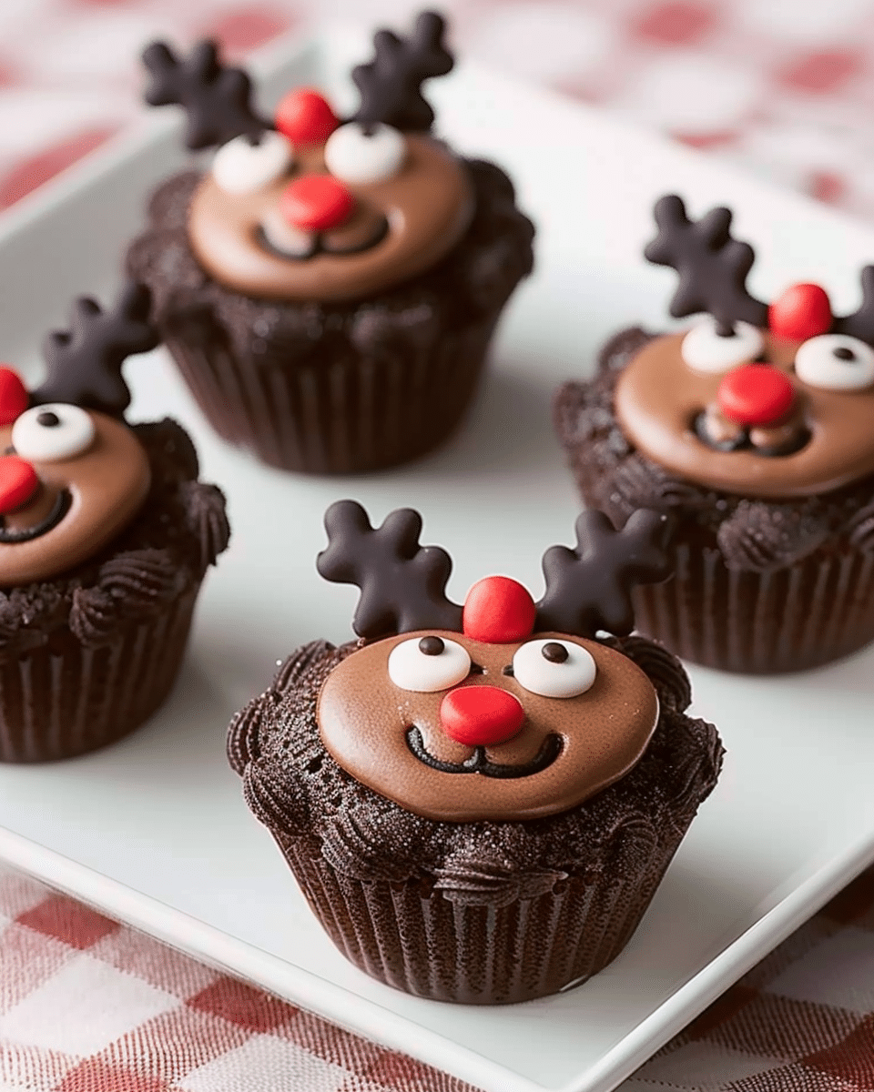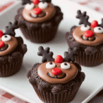Festive and fun, these reindeer cupcakes are decorated with chocolate antlers, red noses, and candy eyes—perfect for holiday parties, baking with kids, or edible gifts.