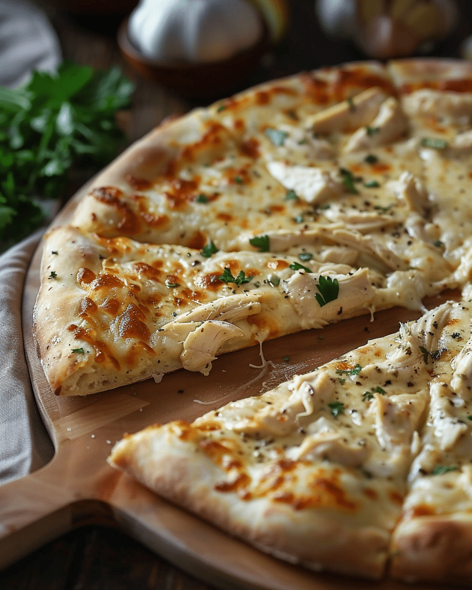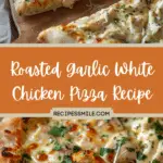 This roasted garlic white chicken pizza features creamy garlic sauce, tender shredded chicken, and melty mozzarella on crispy crust. A cozy and flavorful dinner favorite!