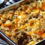 A hearty oven-baked dish made with ground beef, cabbage, rice, and tomatoes—this savory bake is pure comfort in every bite.