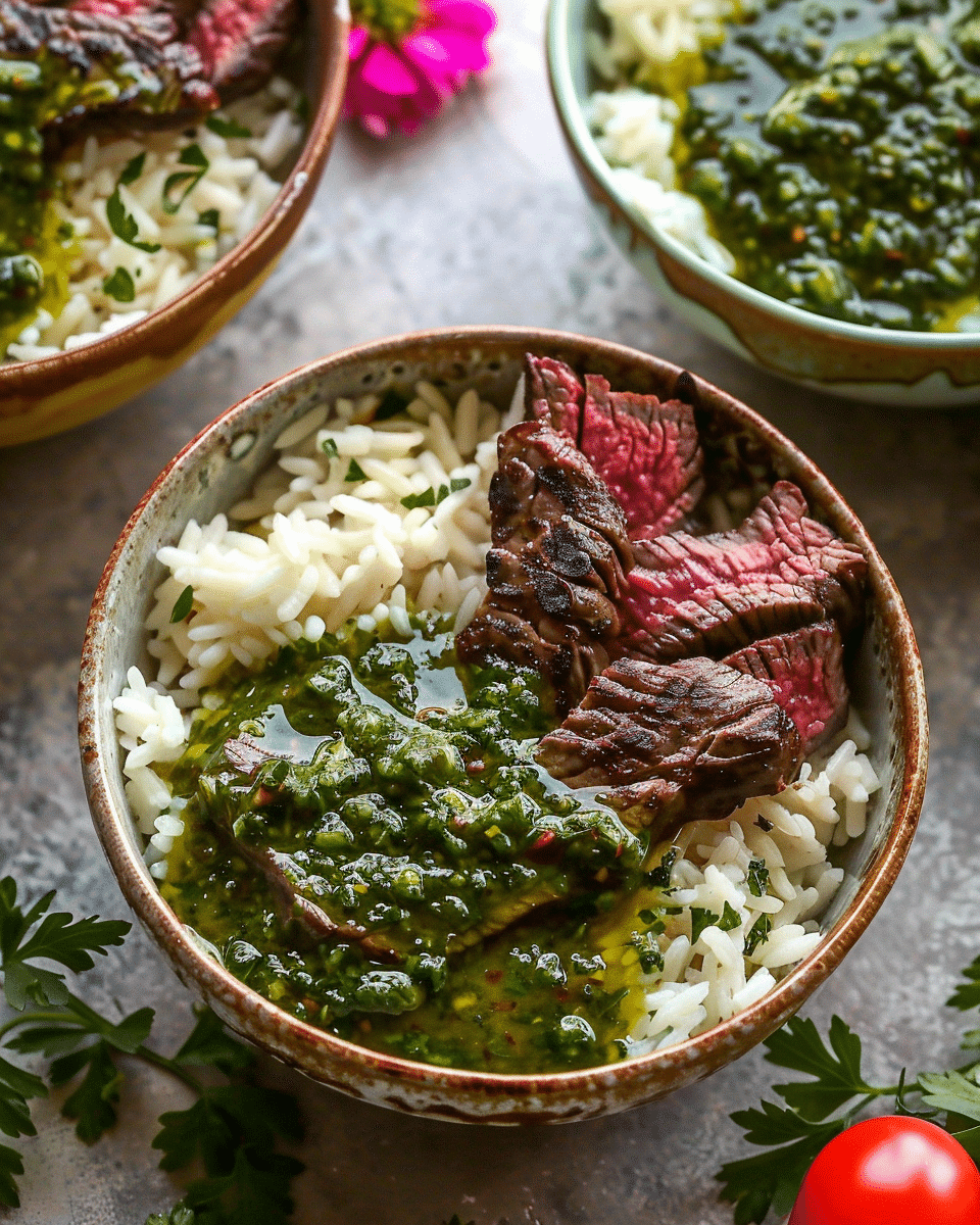 Divide cooked rice into bowls. Top with sliced steak and a generous drizzle of chimichurri sauce.