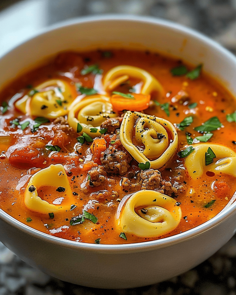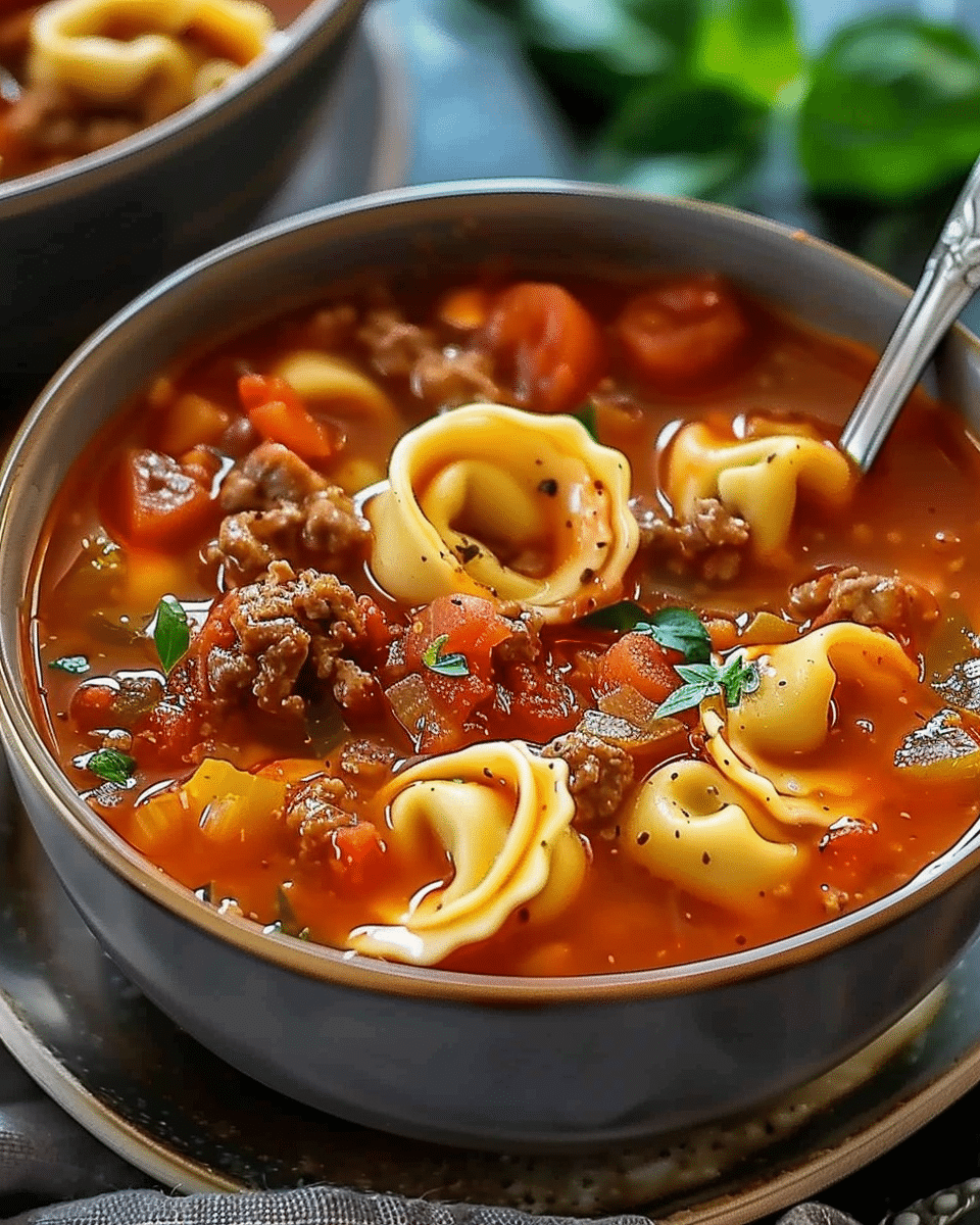PrintSlow Cooker Tomato Tortellini Soup with Ground Beef