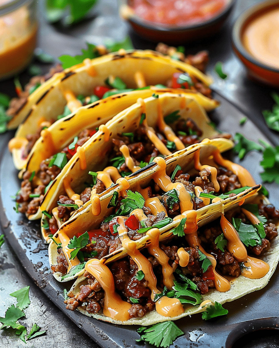 Smashed Cowboy Butter Burger Tacos are a bold, flavor-packed twist on two classic comfort foods—burgers and tacos. With crispy tortillas, juicy beef, melted cheese, and that spicy dipping sauce on the side, it’s hard not to love every single bite. Whether I’m making them for friends or just satisfying my own craving, they always deliver serious flavor and serious fun.