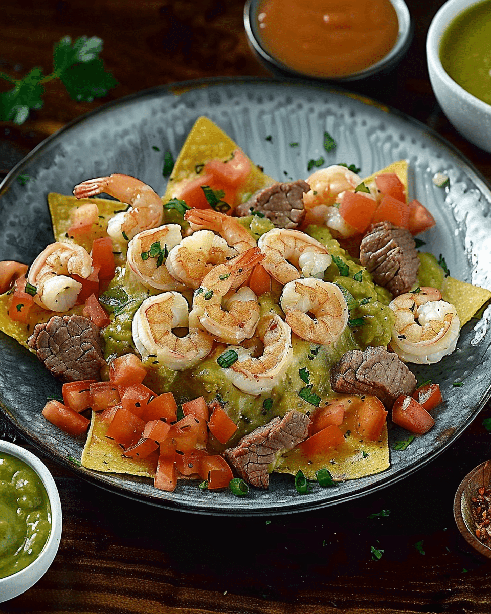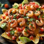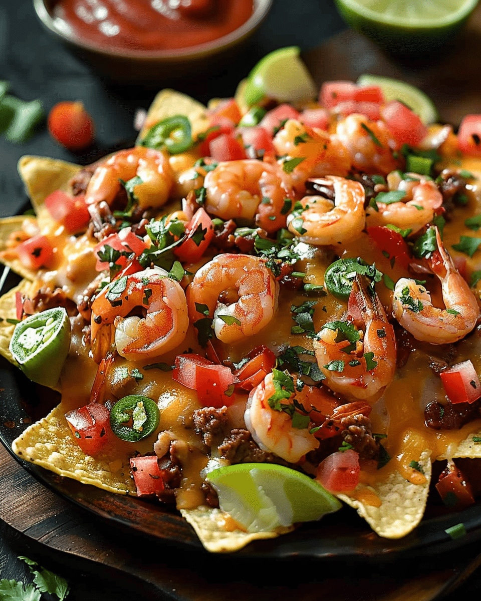 These loaded nachos bring bold Southern flavor with juicy shrimp, seasoned beef, and creamy cheese layered over crisp tortilla chips—perfect for parties or game day!