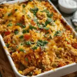 This cheesy Southwest chicken and rice casserole is packed with taco rice, beans, corn, and spicy tomatoes. An easy weeknight dinner that’s creamy, comforting, and crowd-pleasing.
