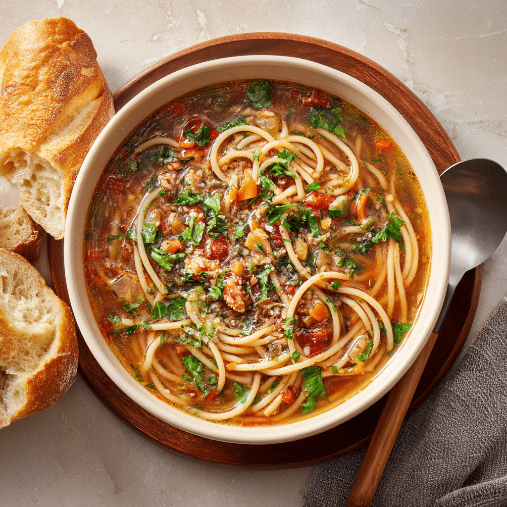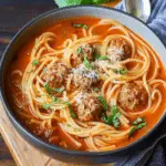 Spaghetti soup with meatballs is a cozy, kid-friendly dinner that blends tender pasta, rich marinara, and juicy meatballs in one hearty bowl.