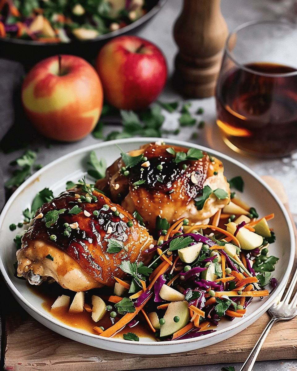 I love how this dish turns simple ingredients into something that feels festive and comforting. The chicken is sticky, flavorful, and tender, simmered in a cider glaze that’s perfectly balanced with a touch of sweetness from maple syrup. The autumn slaw adds a fresh, crunchy contrast that lightens everything up. Whether I’m making a weeknight dinner or hosting friends on a chilly evening, this recipe always impresses without being fussy.