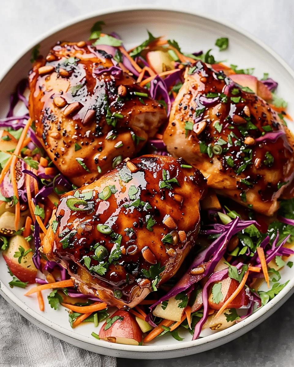 This fall-perfect dinner features sticky glazed apple cider chicken paired with crisp, tangy autumn slaw. A cozy, sweet-and-savory meal made to impress.
