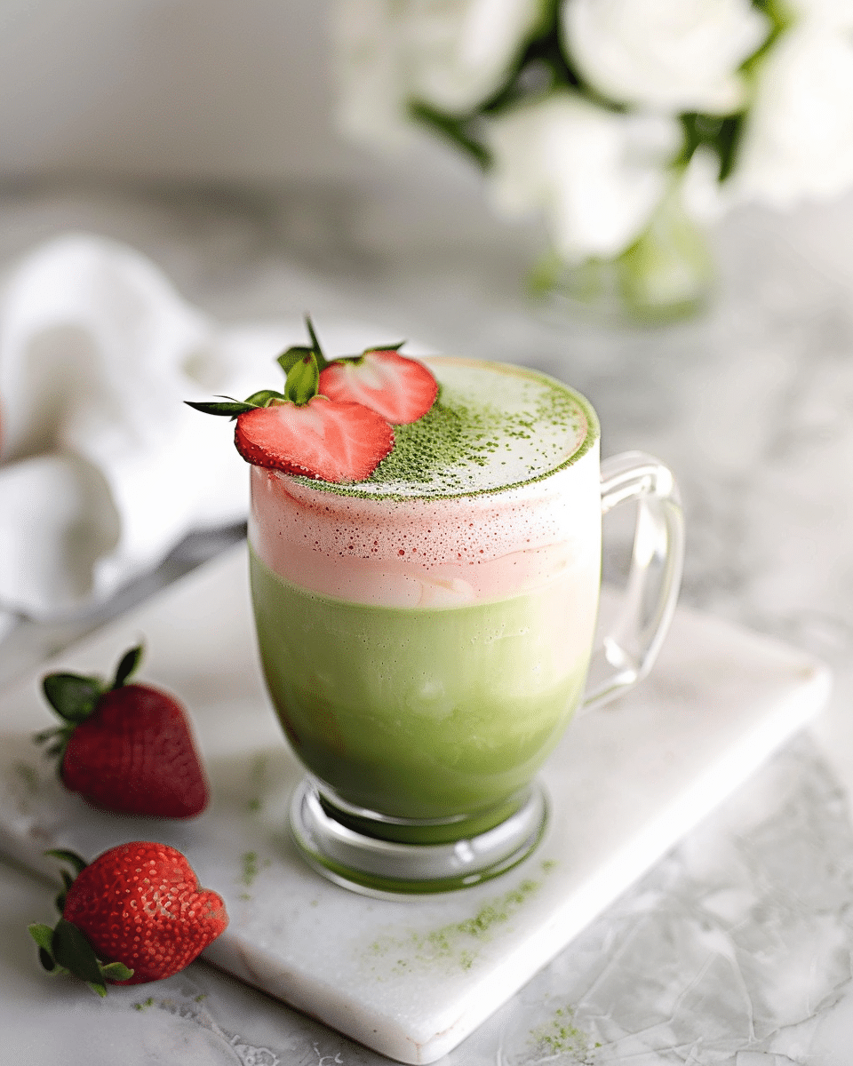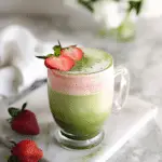 The best strawberry matcha latte with smooth matcha, sweet strawberries, and creamy milk. A beautiful and refreshing drink perfect for any time of day.