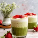 Refreshing strawberry oat milk matcha latte with creamy layers and a naturally sweet fruity twist, perfect for a quick café-style drink at home.