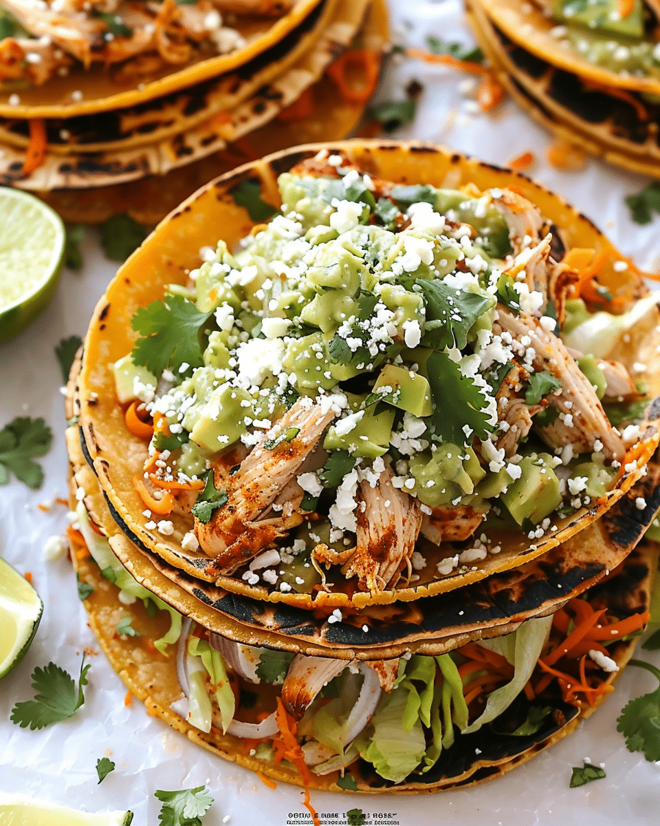 Assemble the Tacos: I spread avocado onto each tortilla, pile on the chicken tinga, and top with red onion, cotija, cilantro, and a squeeze of lime.