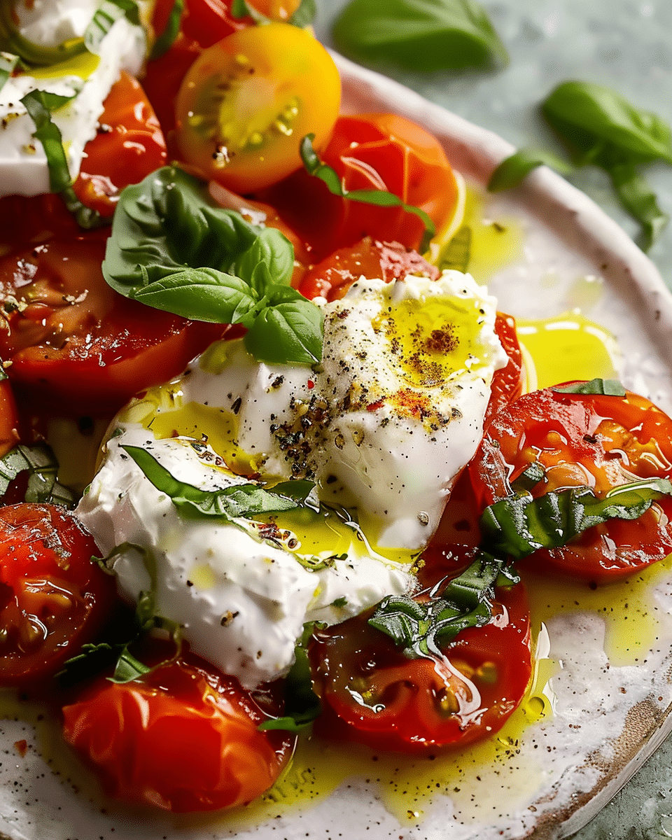 Add Burrata: Place chilled burrata balls on top of tomatoes. Tear gently to release the creamy centers.