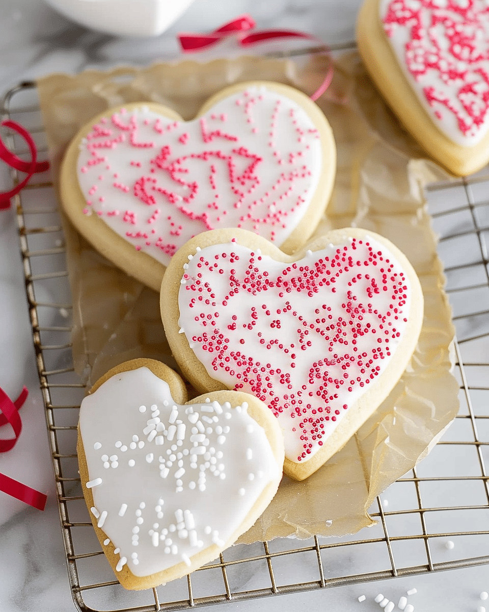 I love this recipe because it makes cookies that are buttery, soft in the center, and just the right amount of sweet. The combination of cake flour and all-purpose flour gives them a melt-in-the-mouth texture. The frosting dip technique is easy and gives a flawless, bakery-style finish. Whether I’m baking with kids or prepping gifts for Valentine’s Day, these cookies are always a hit.