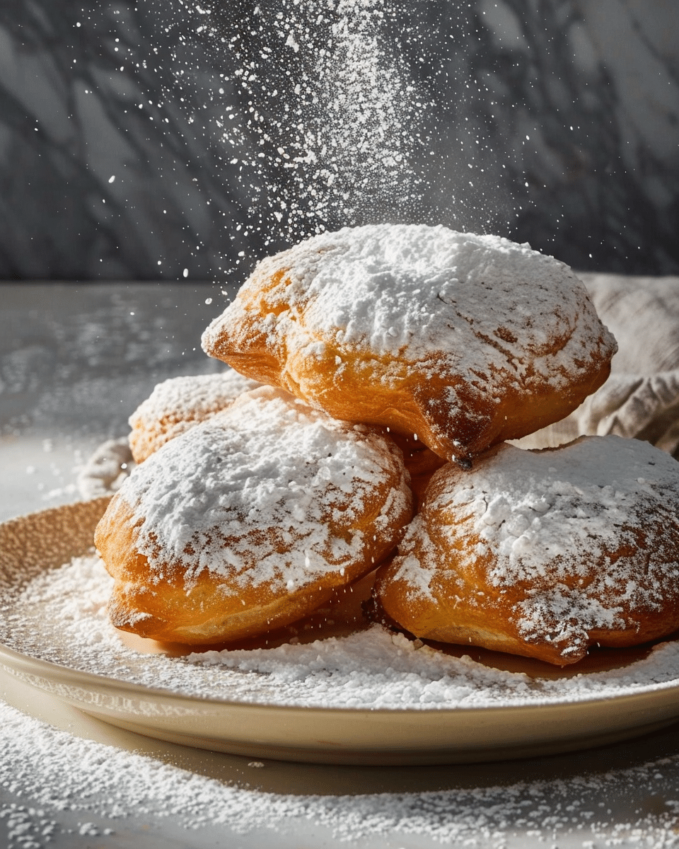 While the beignets are still warm, I dust them generously with powdered sugar and serve them immediately.