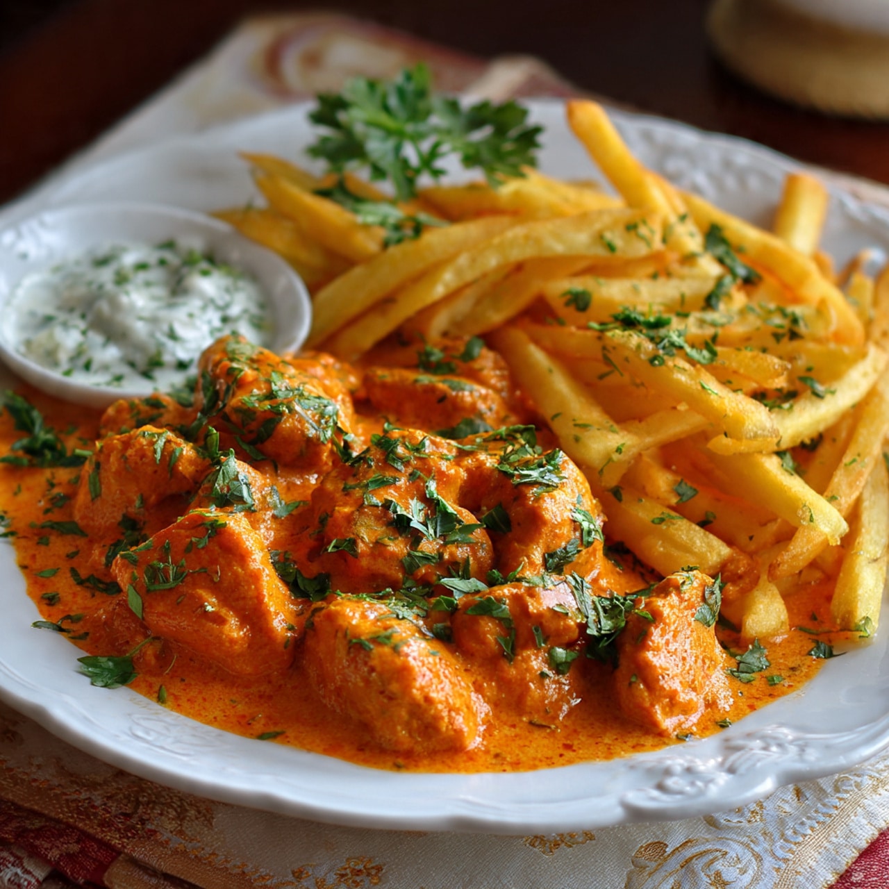 Assemble & Serve I arrange the hot fries in a shallow bowl or plate, then spoon the creamy butter chicken on top. I garnish with fresh chopped cilantro or parsley and serve immediately while hot.
