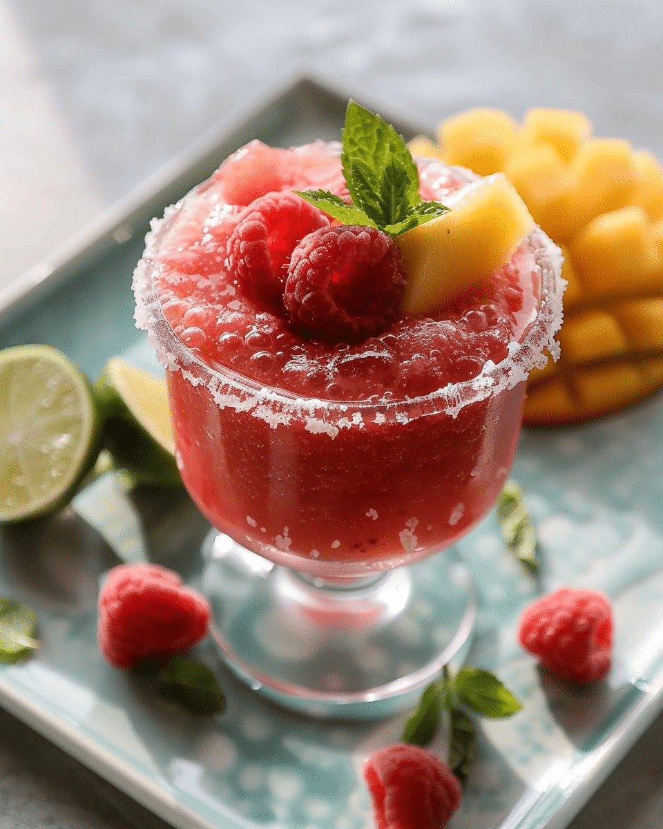 Garnish: fresh raspberries, mango slices, or lime wheels