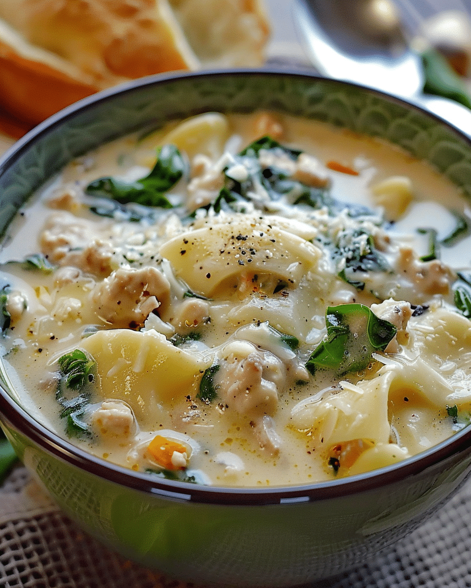 Add cooked pasta and fresh spinach to the soup. Simmer for 2–3 minutes until spinach wilts and soup thickens slightly.