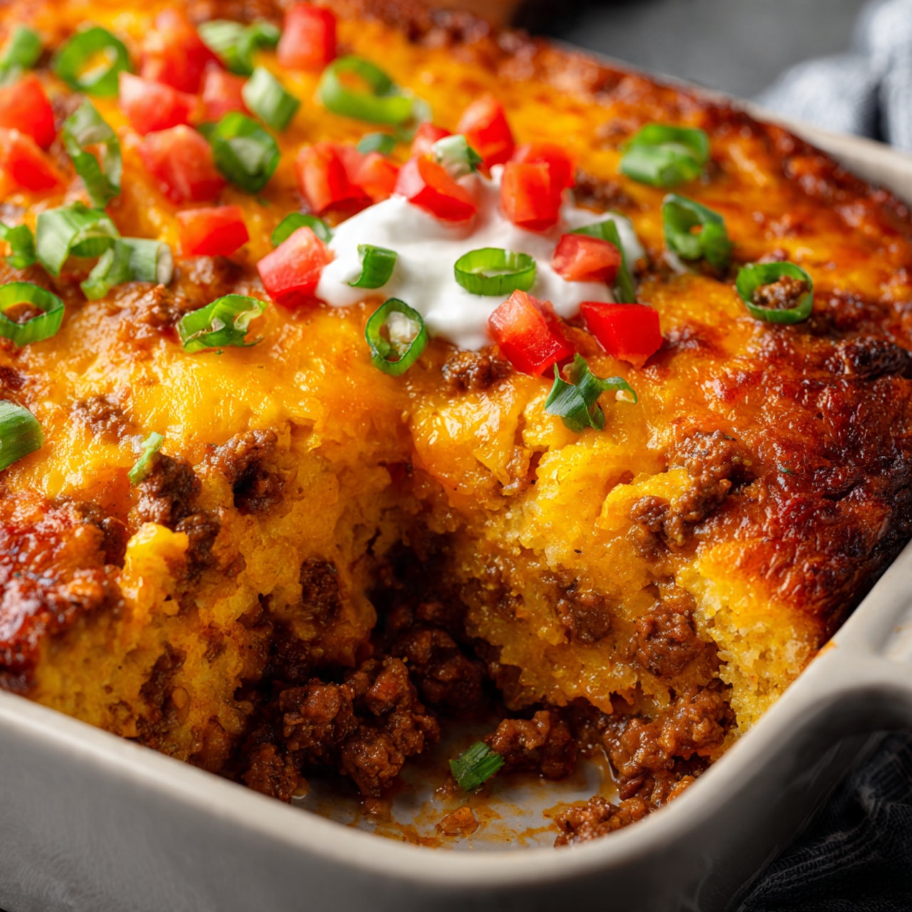 Once out of the oven, I let the casserole cool slightly and garnish it with extra pickles, diced tomatoes, shredded romaine, or reserved onions for that burger-style finish.