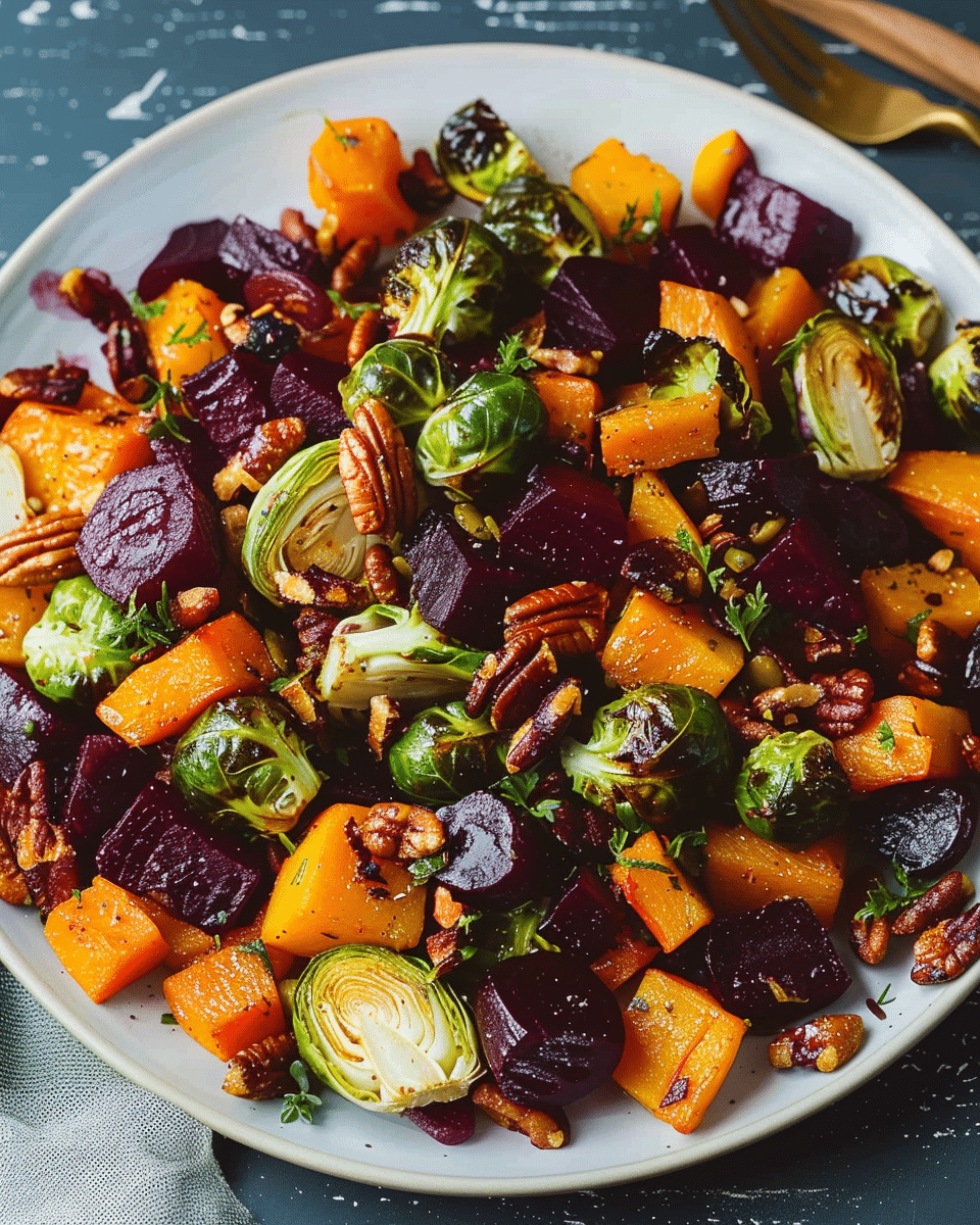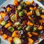 A colorful and hearty winter salad made with roasted butternut squash, Brussels sprouts, and beets. Perfect for cozy dinners or festive holiday meals like Thanksgiving and Christmas.